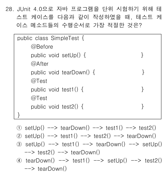 앞서 설명해 드린 JUnit4의 실행 순서(라이프사이클) 개념을 정확히 묻고 있는 아주 좋은 문제입니다! 함께 차근차근 풀어볼까요? 문제에 주어진 SimpleTest 클래스에는 4개의 메서드가 있고, 각각 다음과 같은 어노테이션(명찰)이 붙어 있습니다. JUnit은 @Test가 붙은 메서드를 하나씩 실행하면서, 그 앞뒤로 @Before와 @After를 샌드위치처럼 끼워 넣습니다.