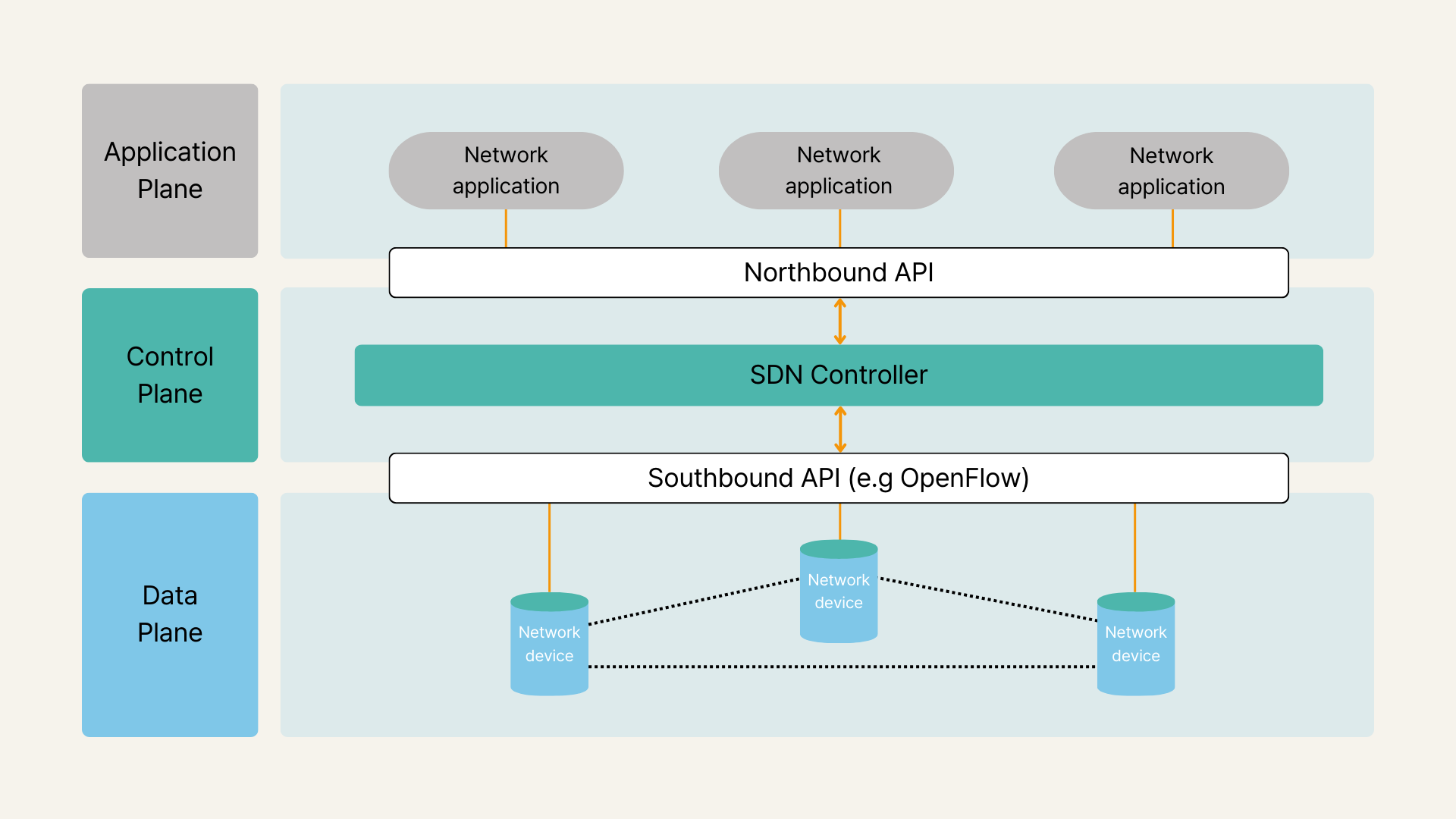 SDN은 논리적으로 수직적인 3단계 계층 구조를 가집니다.