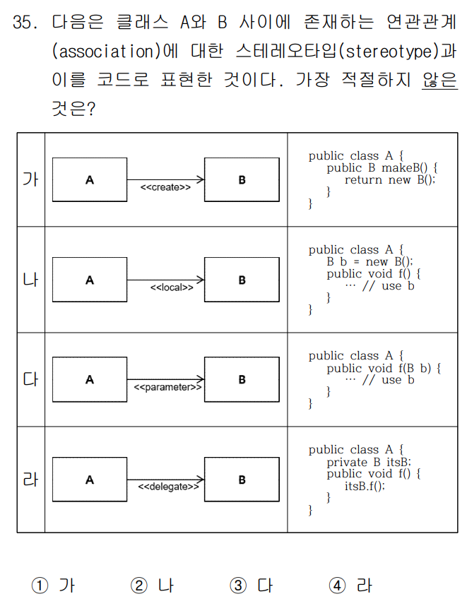 ① (가) : <<create>> 다이어그램의 의미 : 클래스 A가 클래스 B의 인스턴스를 생성한다는 의미입니다. 메서드 내부에서 new B()를 호출하여 객체를 생성하고 있으므로 적절합니다.